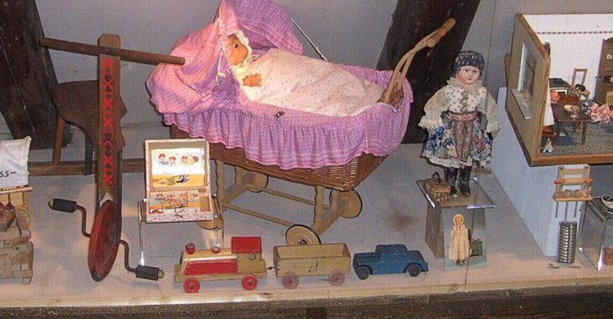 nach 35 Jahren alt geworden. Sie muss dringend von einem Fachmann erneuert werden. In dieser Vitrine zeigen wir seit vielen Jahren Kinderspielzeug. Wir wechseln häufig die