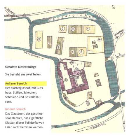 Die Gebäude im äußeren Bereich stehen in Zusammenhang, mit dem, was heute an dieser Stelle steht: Bäckerei, Schmiede, Priesterwohnhaus, Klostermühle. Wir haben außerdem Vergleiche mit anderen Klosteranlagen zur Hilfe gezogen (z. B. die Klosteranlage von Maulbronn)