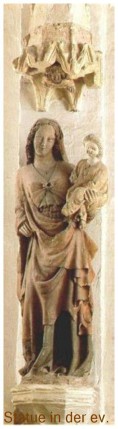 Diese schöne gotische Marienstatue aus Sandstein war farbig gefasst, Farbreste sind noch zu erkennen. Sie kam um 1330 in die Klosterkirche und hat Plünderungen, Zerstörungen, Brandschatzung und Demolierungen überstanden. Nur der Kopf des Jesuskindes hatte es nicht geschafft. Er musste erneuert werden und wurde bei der Kirchenrenovierung 1899 wieder ergänzt.
